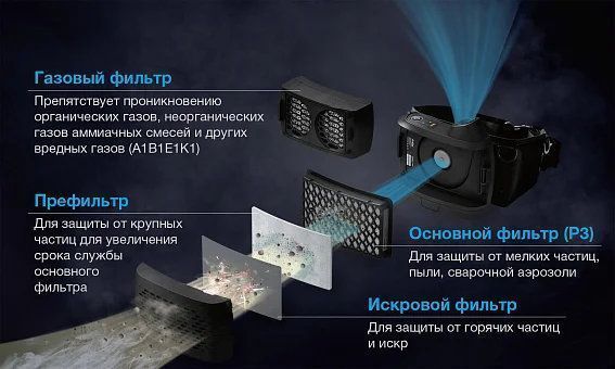 В стандартную комплектацию входят специальный Префильтр для PAPR и Основной фильтр для PAPR. Они обеспечивают надежную защиту органов дыхания от пыли, газов, паров и аэрозолей. Префильтр и основной фильтр, по рекомендации завода производителя TECMEN, меняются один раз в день. Эффективность фильтра составляет 99,97%.