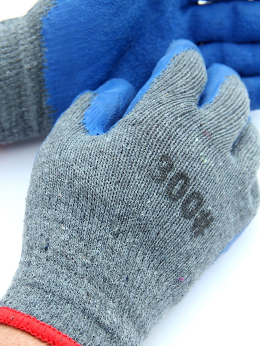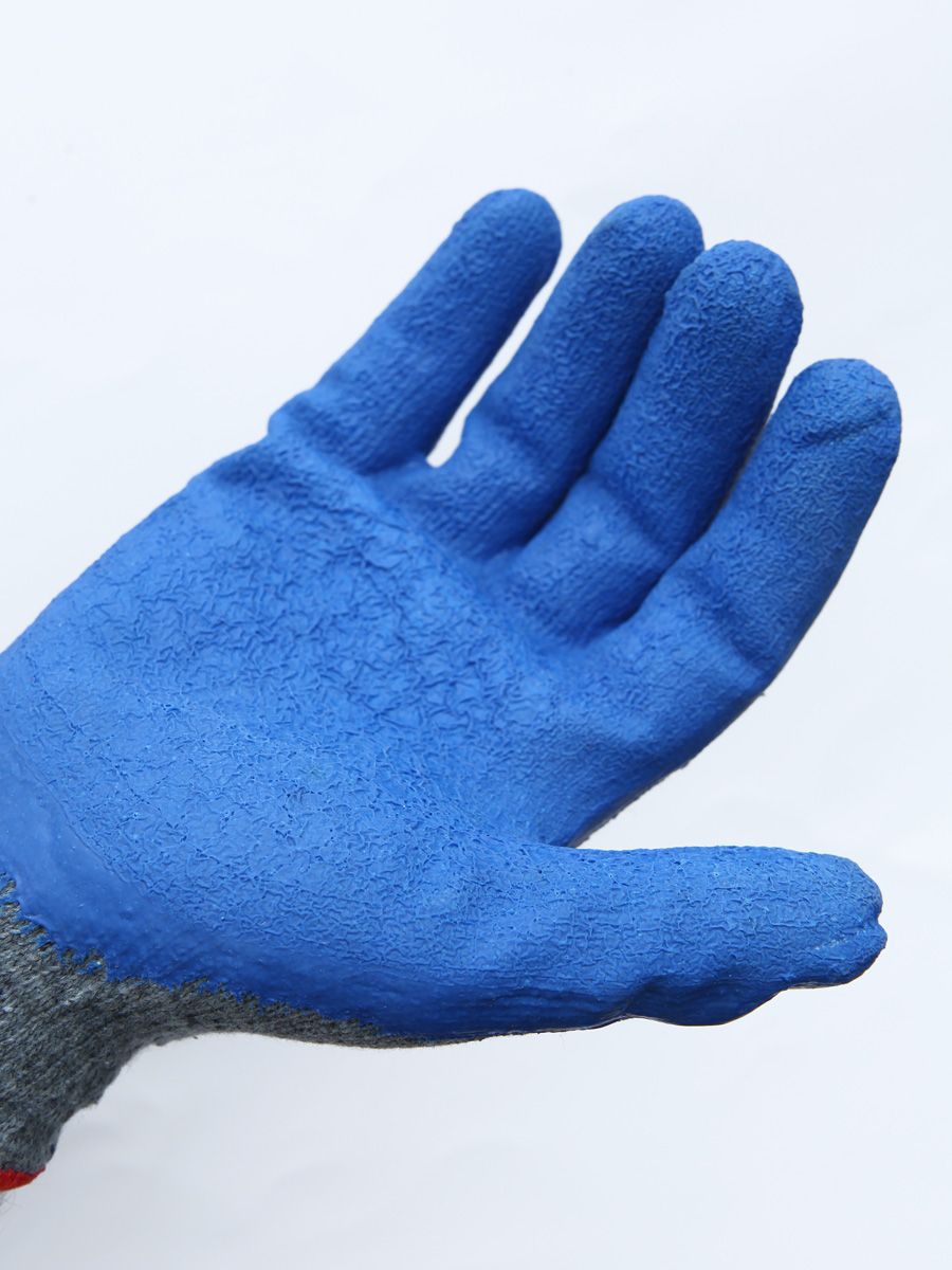 При работах с арматурой, стеклом, колющими, режущими предметами используют хлопчатобумажные перчатки с латексной обливкой ладони. Материал обладает высокой воздухопроницаемостью, впитывает пот, что обеспечивает высокий уровень комфорта. Перчатки плотно прилегают к рукам, но не стесняют движений. Латексное покрытие не скользит, что гарантирует надежный сухой и мокрый хват ладони. Материал достаточно плотный, но позволяет сохранить высокую тактильную чувствительность руки.