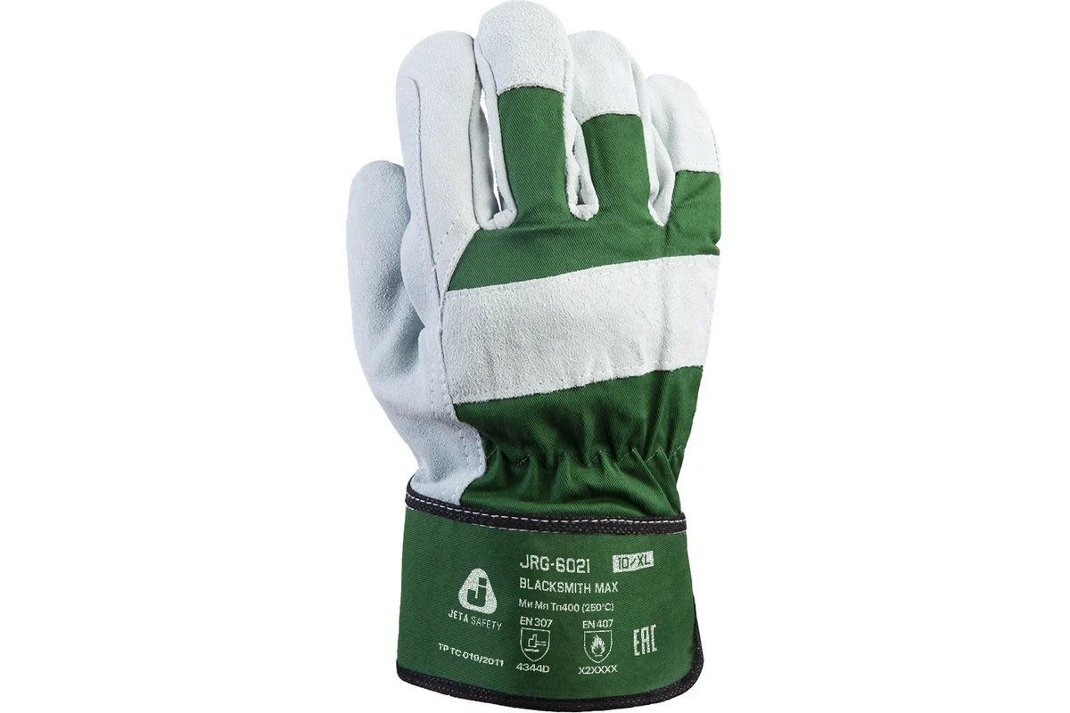 JRG-6021 Blacksmith Max Перчатки комбинированные Jeta Safety из спилковой кожи и хлопчатобумажной ткани с дополнительной накладкой на ладони из натуральной кожи, с подкладкой из флиса, серый/зеленый