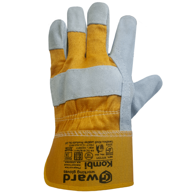 Универсальные комбинированные перчатки выполнены из хлопчатобумажной основы и цельной детали из кожевенного спилка. Применяются в работе с металлоконструкциями, абразивами, камнем, пиломатериалами. Натуральная ткань обеспечивает вентиляцию, манжеты надежно удерживают перчатки на руках. Кожевенный спилок защищает от механических нагрузок, на пальцах и на обратной стороне руки покрытие частичное.