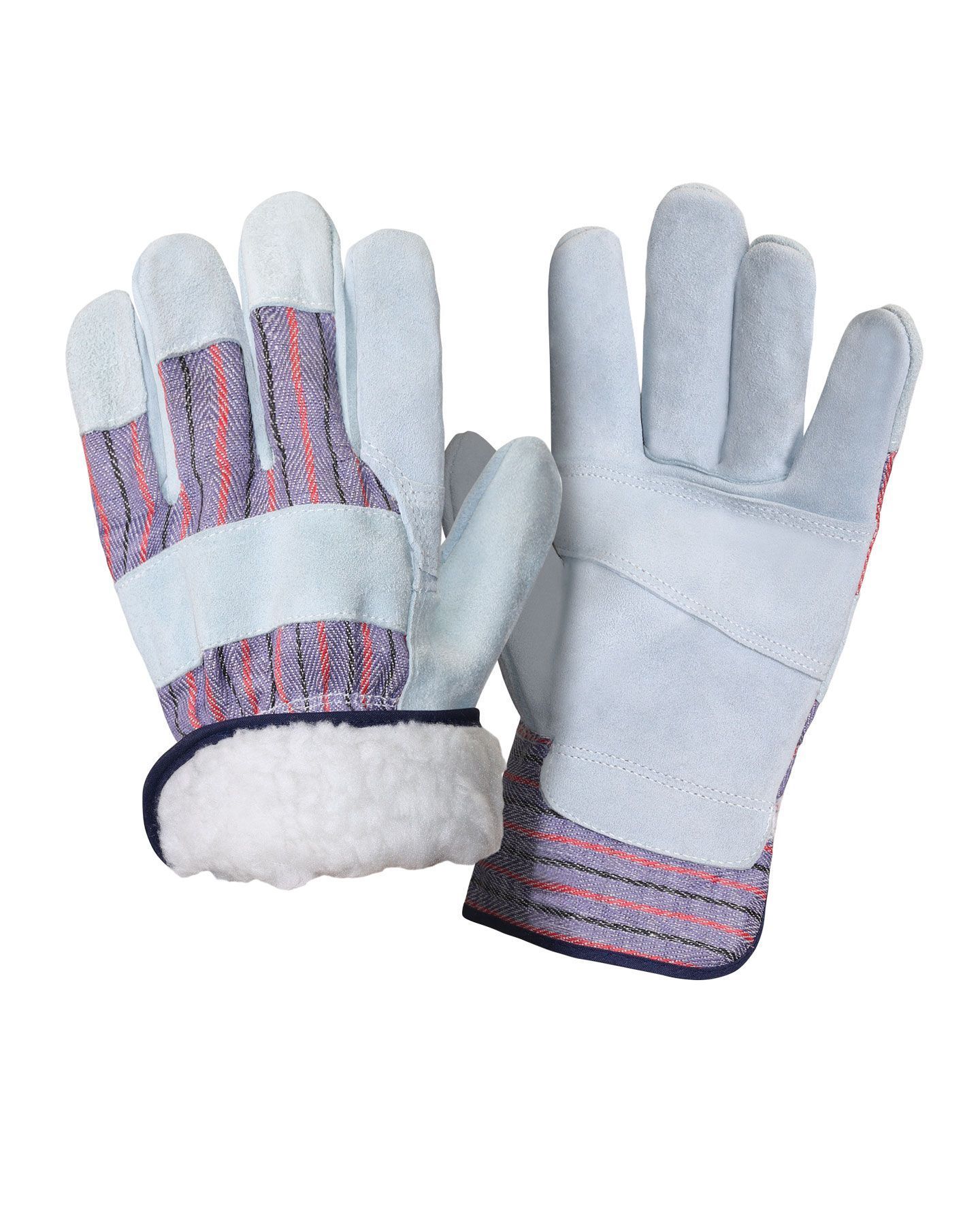 Плотные перчатки с отворотными крагами и утеплением. Хлопчатобумажная ткань комфортна для кожи, меховой слой внутри сохраняет тепло, кожевенный спилок защищает от производственных травм при работе с пиломатериалами, металлом, камнем, абразивами. Ладонная сторона усилена, на пальцах и на тыльной стороне покрытие частичное.