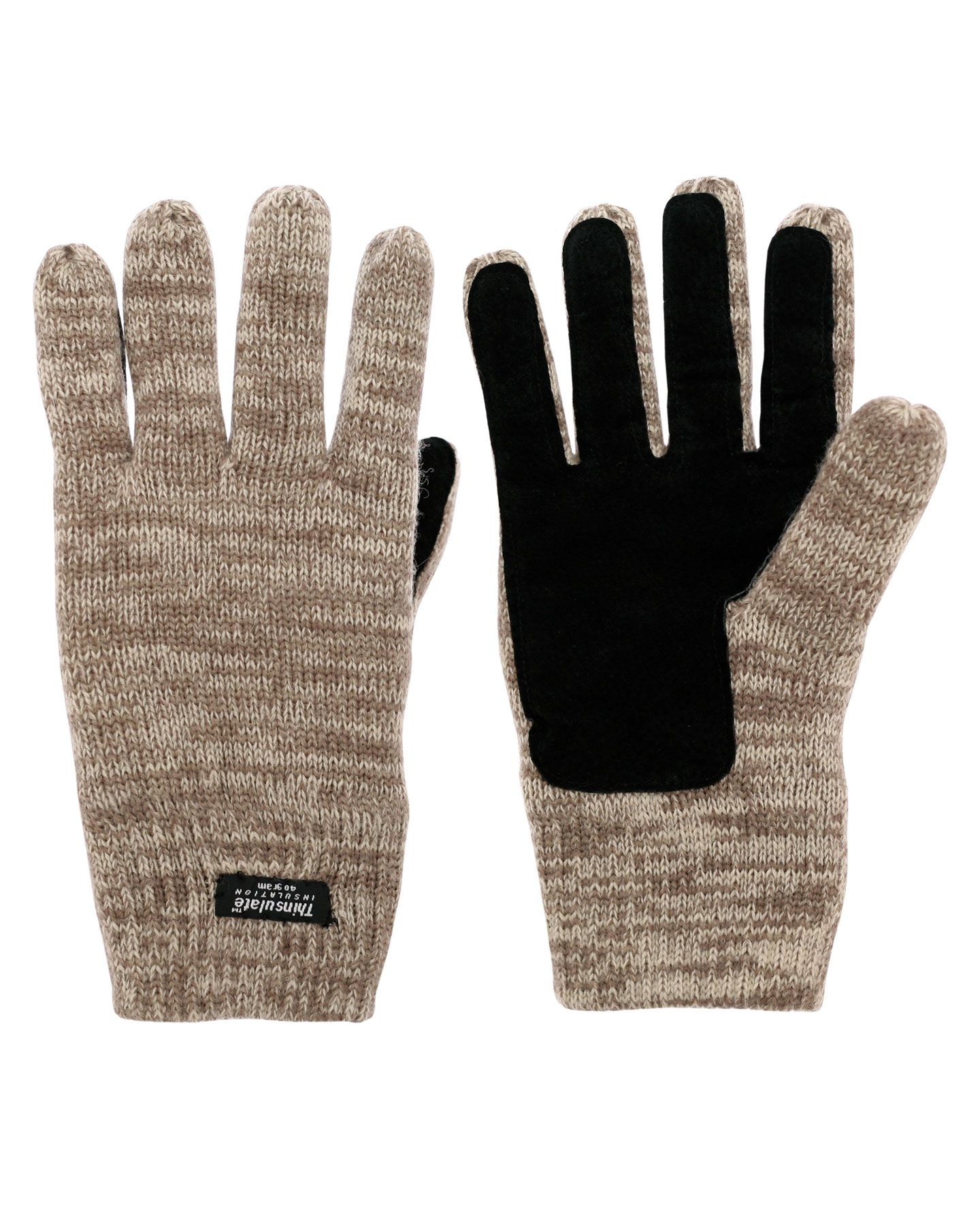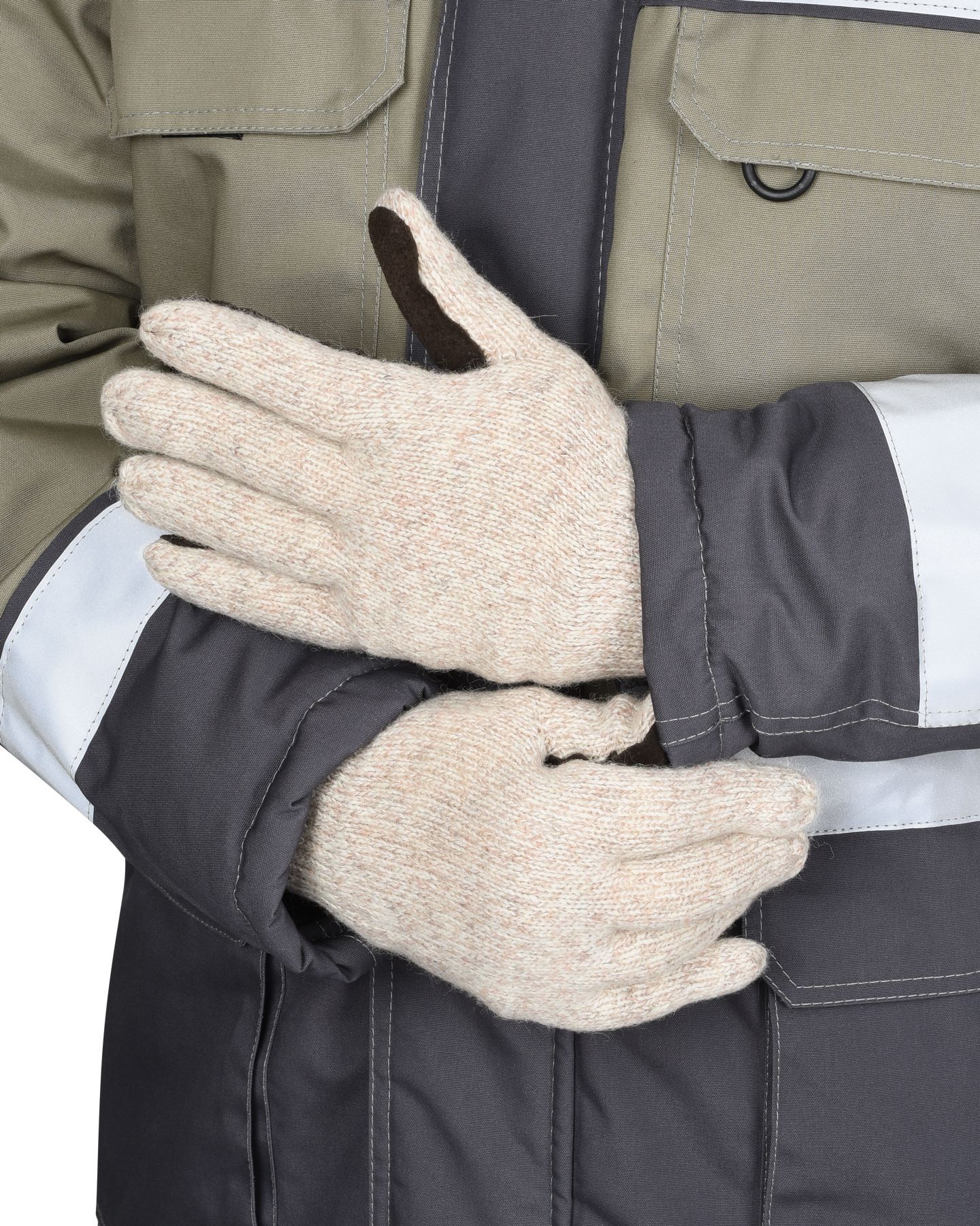 Перчатки из полушерстяной пряжи (шерсть 50%, акрил 50%) с утеплителем Тинсулейт С40 на флисовой подкладке, на ладонной стороне и пальцах с накладками из кожевенного спилка.