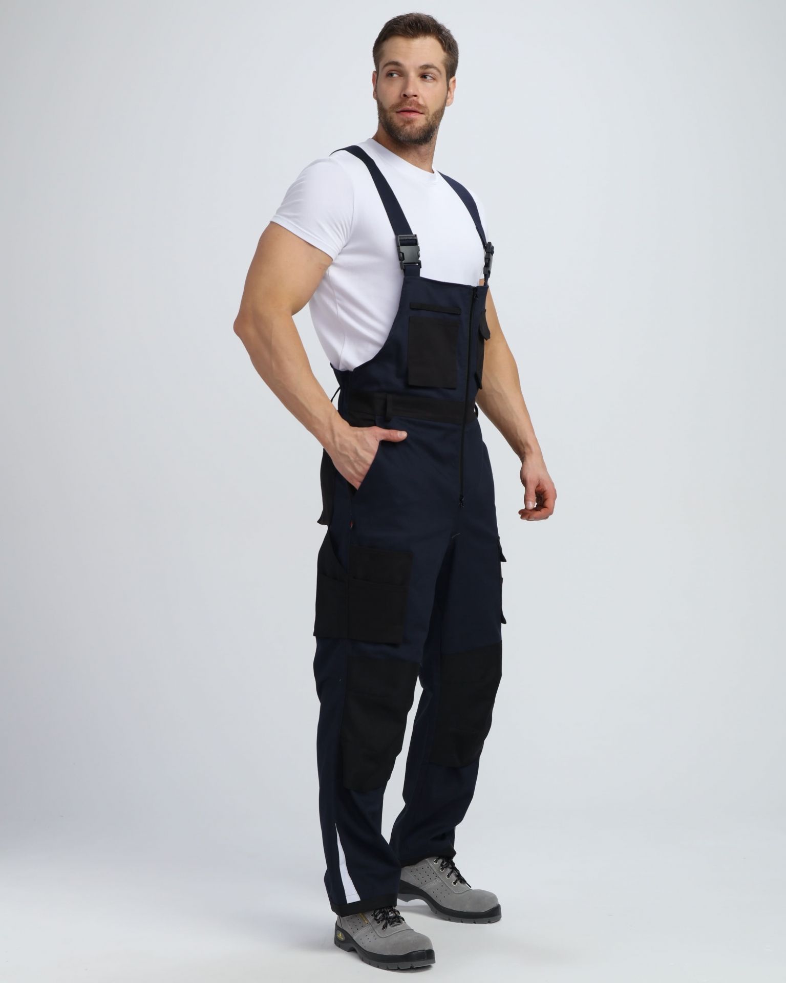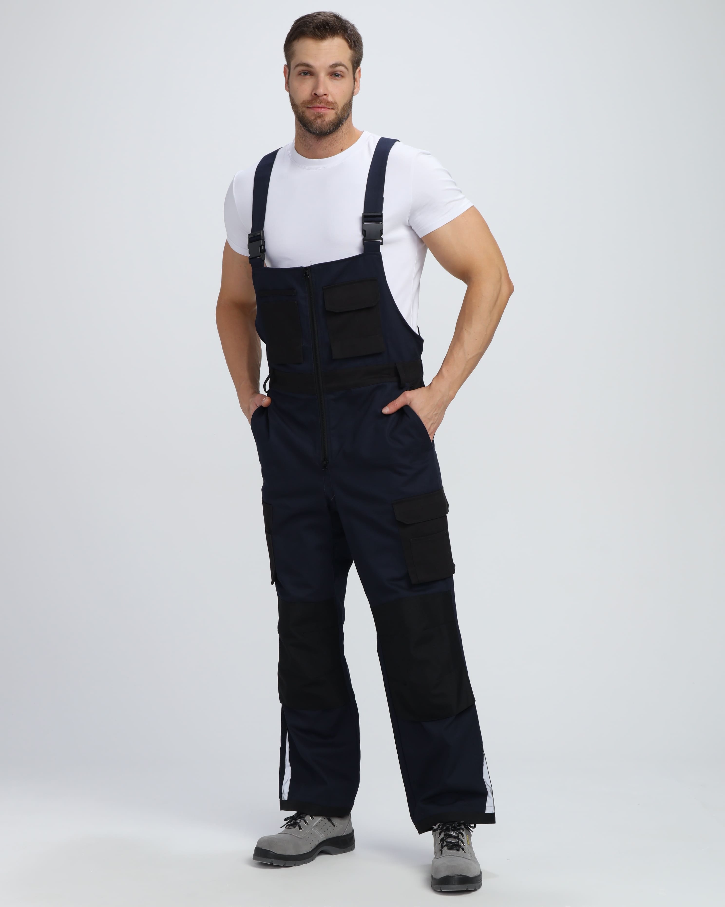 Полукомбинезон мужской рабочий для ИТР изготовлен в соответствии с ГОСТ для защиты от общих производственных загрязнений и механических воздействий. Благодаря бретелям с регулировкой по длине и кулиске на резинке униформа прямого кроя подходит мужчинам разной комплекции, комфортна в работе, не сковывает движения. На груди полукомбинезона располагается большой закрывающийся на липучку карман, помогающий хранить под рукой все необходимые материалы. Дополнительные карманы по бокам подходят для размещения объемных предметов. Спецодежда застегивается на пуговицы спереди и сбоку, удобно надевается и снимается. Отстрочка в цвет ткани придает форме классический внешний вид и помогает комбинировать полукомбинезон с большинством курток.