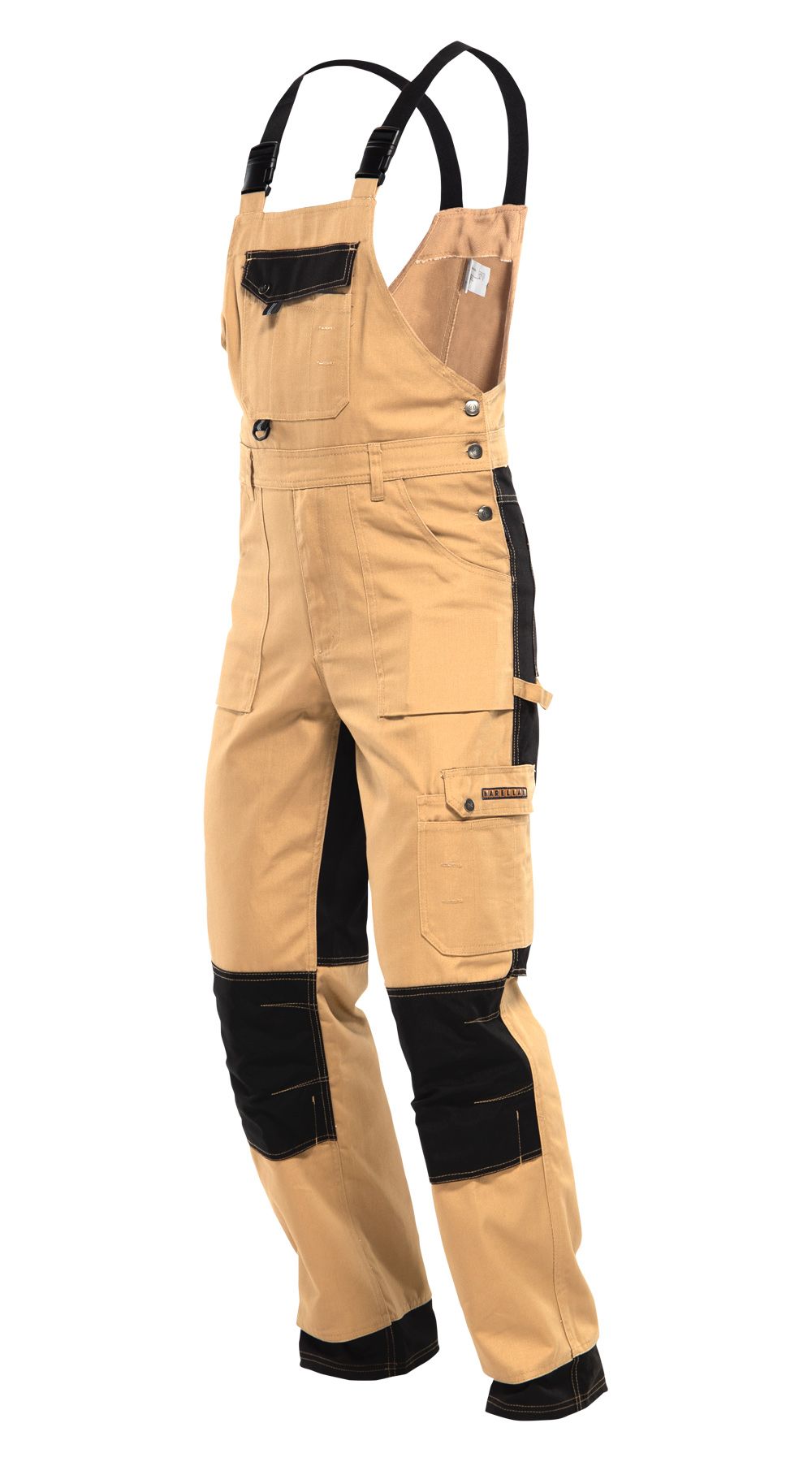 Полукомбинезон прямой, с центральной застёжкой на двухзамковую тесьму - "молния", с накладными боковыми карманами, с эластичной лентой по спинке, для лучшего прилегания. Бретели регулируются при помощи эластичной ленты и пряжек фастексов.