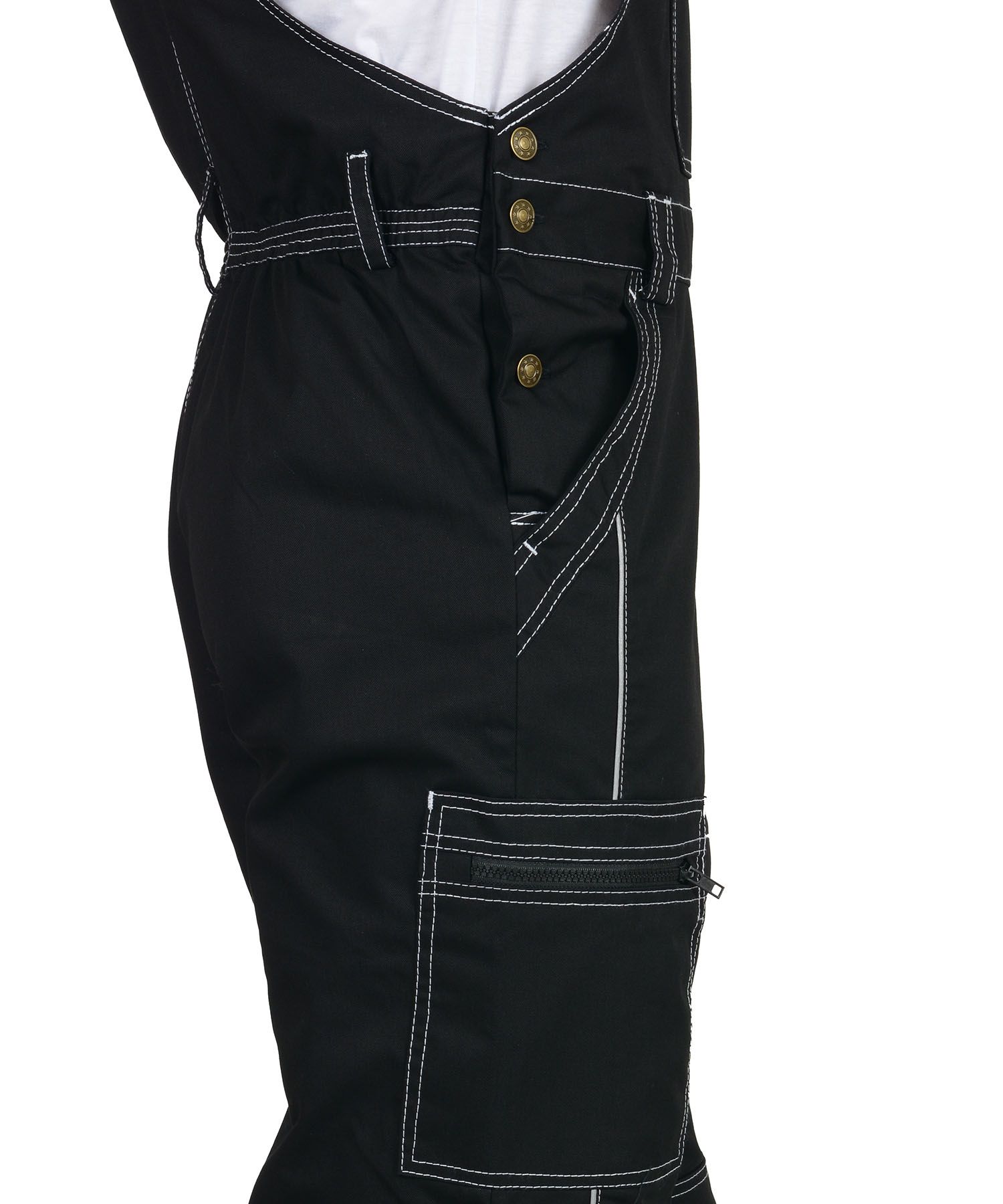 Полукомбинезон прямого силуэта, застежкой гульфика на тесьму - "молния", с различными многофункциональными карманами, с застежкой в правом боковом шве на три обметанные петли и три джинсовые пуговицы, с наколенниками, с бретелями регулируемыми эластичной тесьмой и фастексами, с эластичной тесьмой по линии талии, на передних половинках в рельеф вшивается СВ кант.