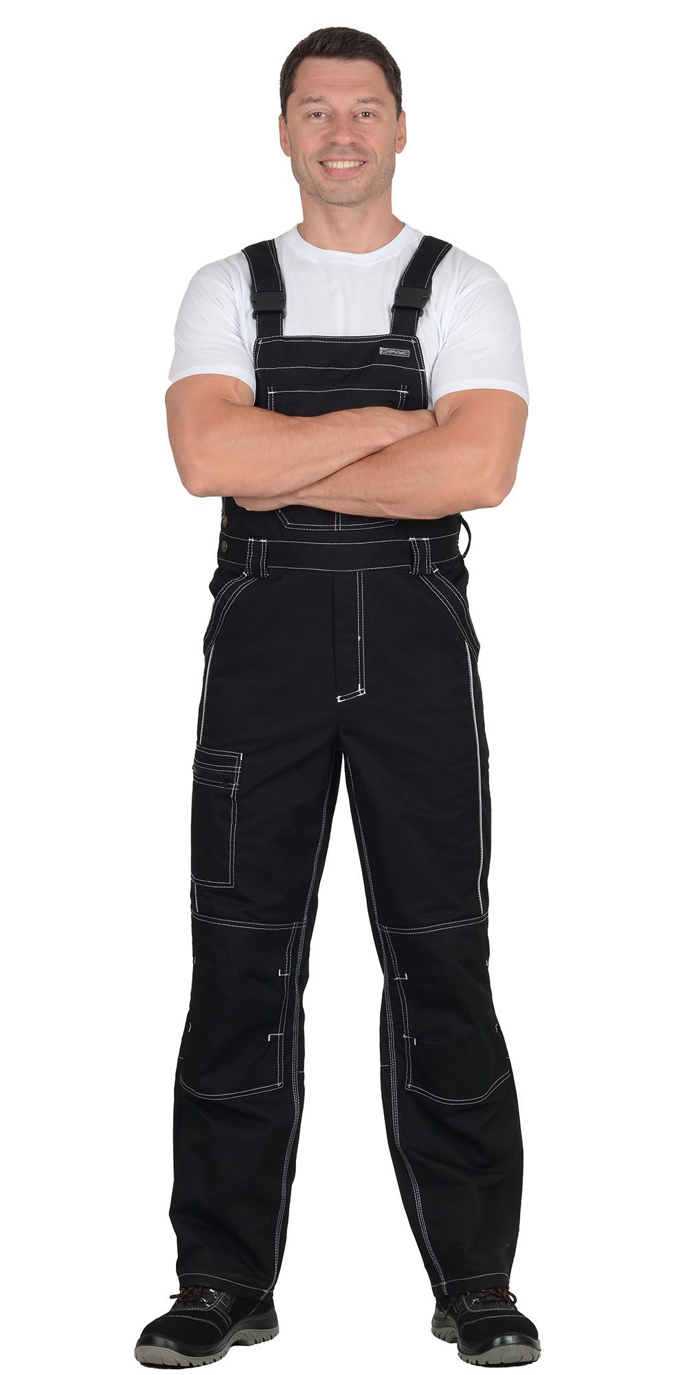 Мужской полукомбинезон. Декоративная двойная строчка контрастного цвета. Отделка контрастная на карманах и клапанах. Застёжка – молния спереди и пуговичная боковая. Регулировка спинки – частичная стяжка. Регулировка лямок – с помощью карабинов. Имеются пять накладных карманов: один на грудке, с клапаном и отстрочкой под инструмент, два больших объёмных боковых с косым входом, один сзади, один на брючине (клапан и отстрочка). Брючины оснащены наколенниками.