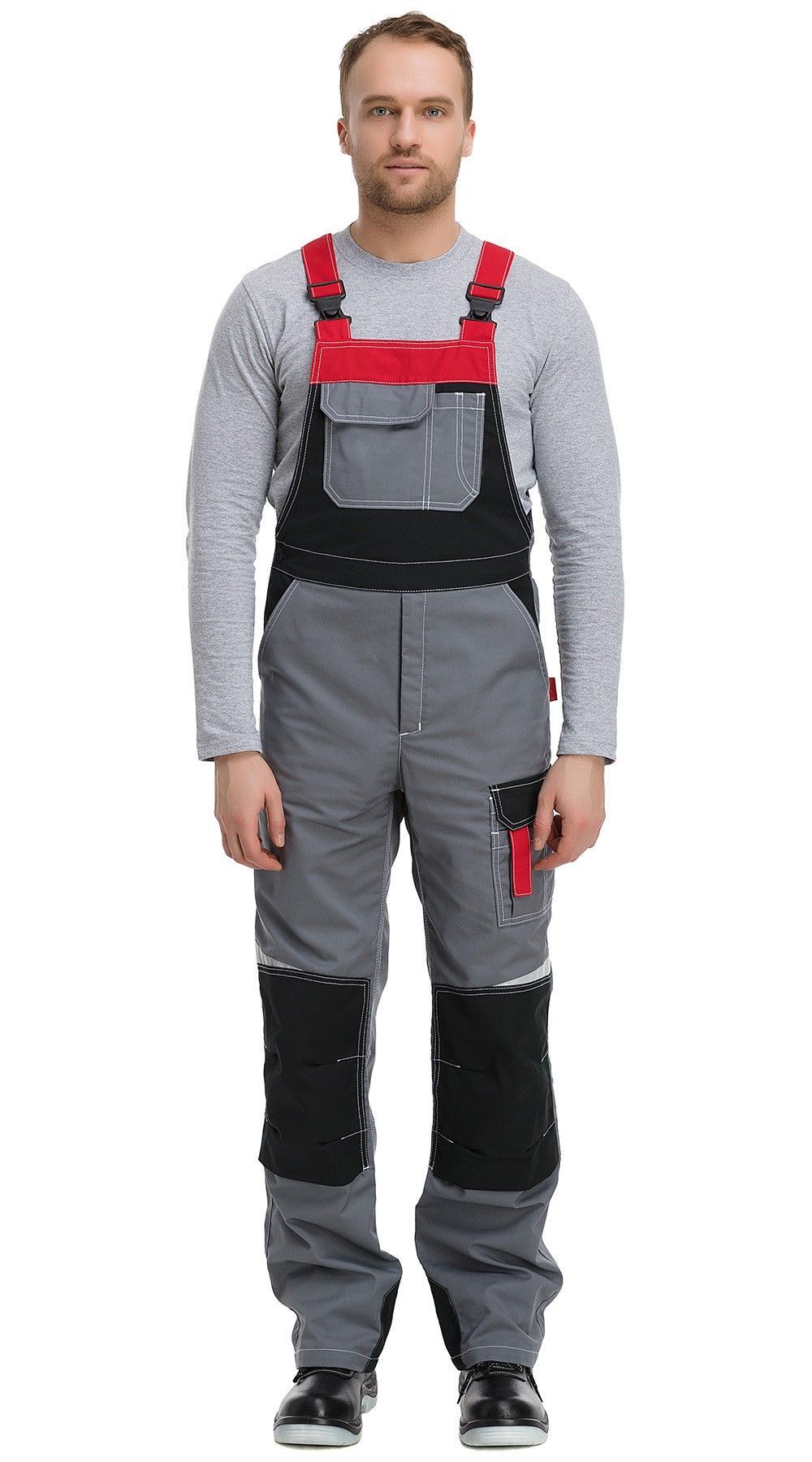 Полукомбинезон имеет черные вставки на груди, клапане брючных карманов, наколенниках, во входах боковых карманов и по низу брючин. Красная отделка в спецодежде используется на груди, лямках.