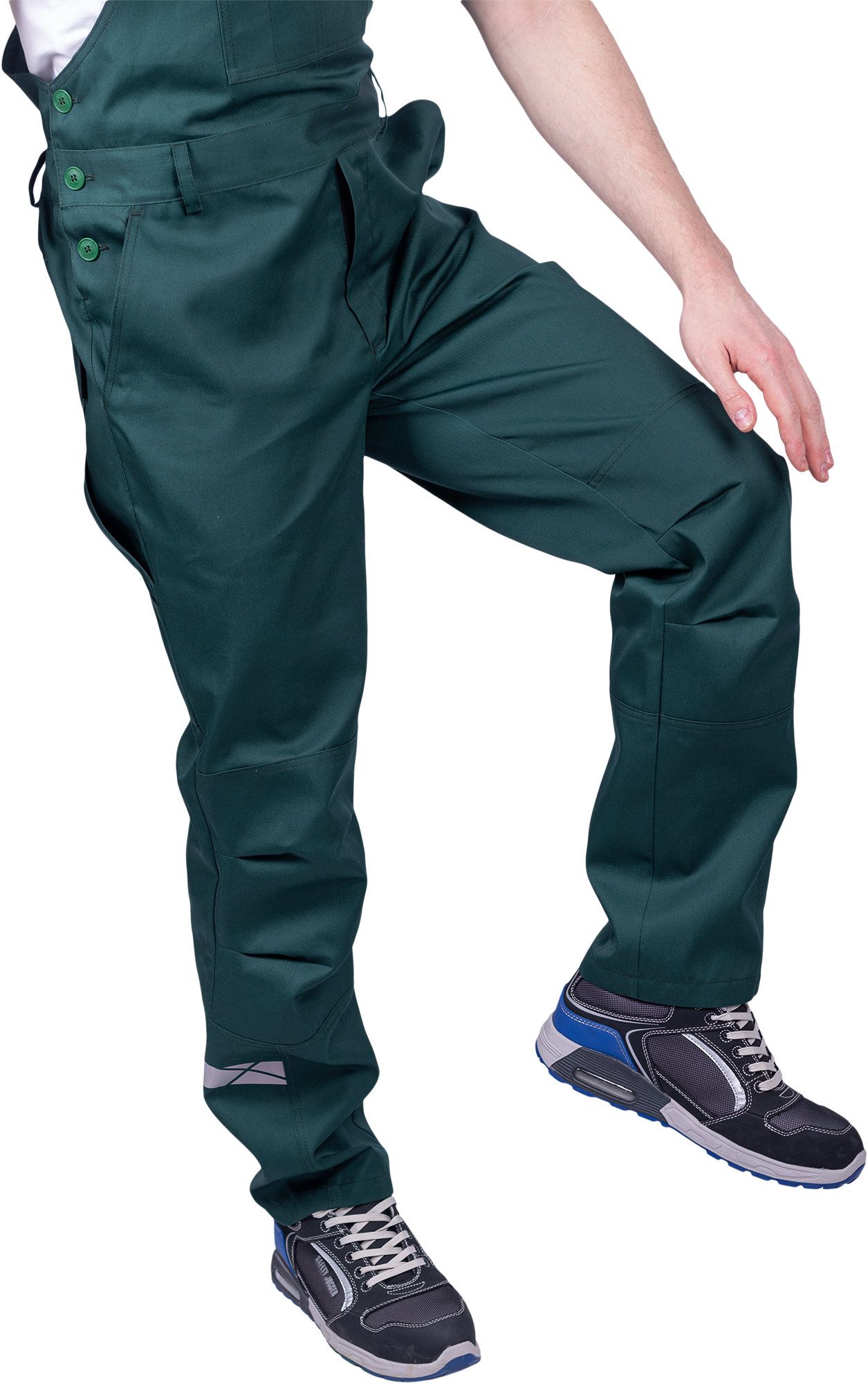 Мужской полукомбинезон. Декоративная двойная строчка контрастного цвета. Отделка контрастная на карманах и клапанах. Застёжка – молния спереди и пуговичная боковая. Регулировка спинки – частичная стяжка. Регулировка лямок – с помощью карабинов. Имеются пять накладных карманов: один на грудке, с клапаном и отстрочкой под инструмент, два больших объёмных боковых с косым входом, один сзади, один на брючине (клапан и отстрочка). Брючины оснащены наколенниками.