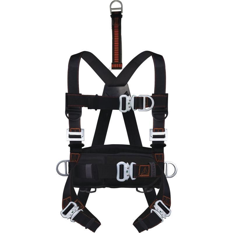 Привязь с поясом. Привязь с 3 точками крепления для защиты от падений (2 спинных, грудная), с грудной лямкой. Удлинитель страховочной точки (D-образное кольцо) на спине для удобного присоединения соединительно-амортизирующей подсистемы. Материал ремней – полиэстер. Регулировка привязи осуществляется с помощью 2 автоматических пряжек на ножных лямках, 2 пряжек на плечевых лямках и автоматической пряжки на грудной лямке. Индикатор падения. Пояс с термоформованной зоной спины, застегиваемый на широкую контактную ленту. 2 боковые точки крепления для позиционирования. 1 автоматическая пряжка, при помощи которой регулируется размер пояса. Мягкая подкладка на спине. 2 дополнительные крепежные петли.