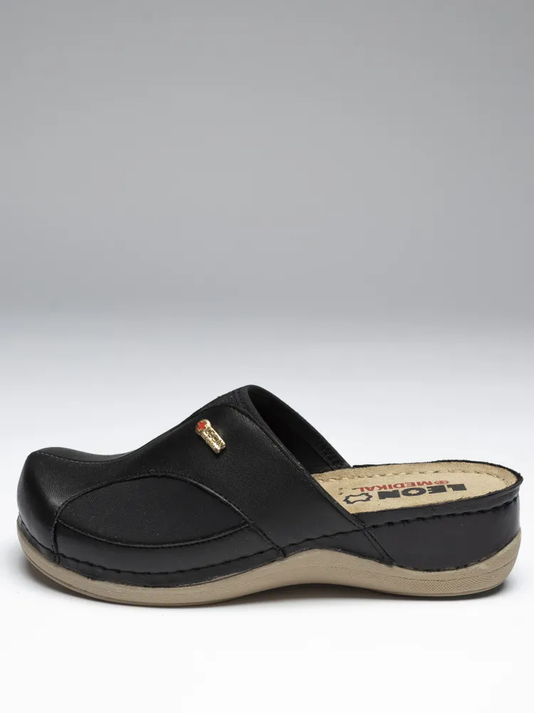 Медицинские кожаные сабо разработаны при участии врачей ортопедов. Натуральная кожа использована для верха, подкладки и стельки обуви. Модель оснащена кожаной анатомической стелькой с эффектом памяти и углублением ложа стопы. Слой массажной пены расположен под кожаной стелькой. При ходьбе осуществляется массажное воздействие на ступню, что улучшает кровообращение и снижает отечность ног. Подошва профессиональной обуви не скользит на кафеле