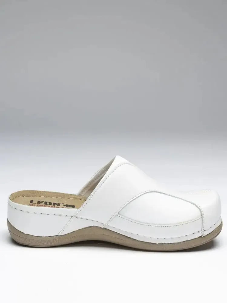 Медицинские кожаные сабо разработаны при участии врачей ортопедов. Натуральная кожа использована для верха, подкладки и стельки обуви. Модель оснащена кожаной анатомической стелькой с эффектом памяти и углублением ложа стопы. Слой массажной пены расположен под кожаной стелькой. При ходьбе осуществляется массажное воздействие на ступню, что улучшает кровообращение и снижает отечность ног. Подошва профессиональной обуви не скользит на кафеле