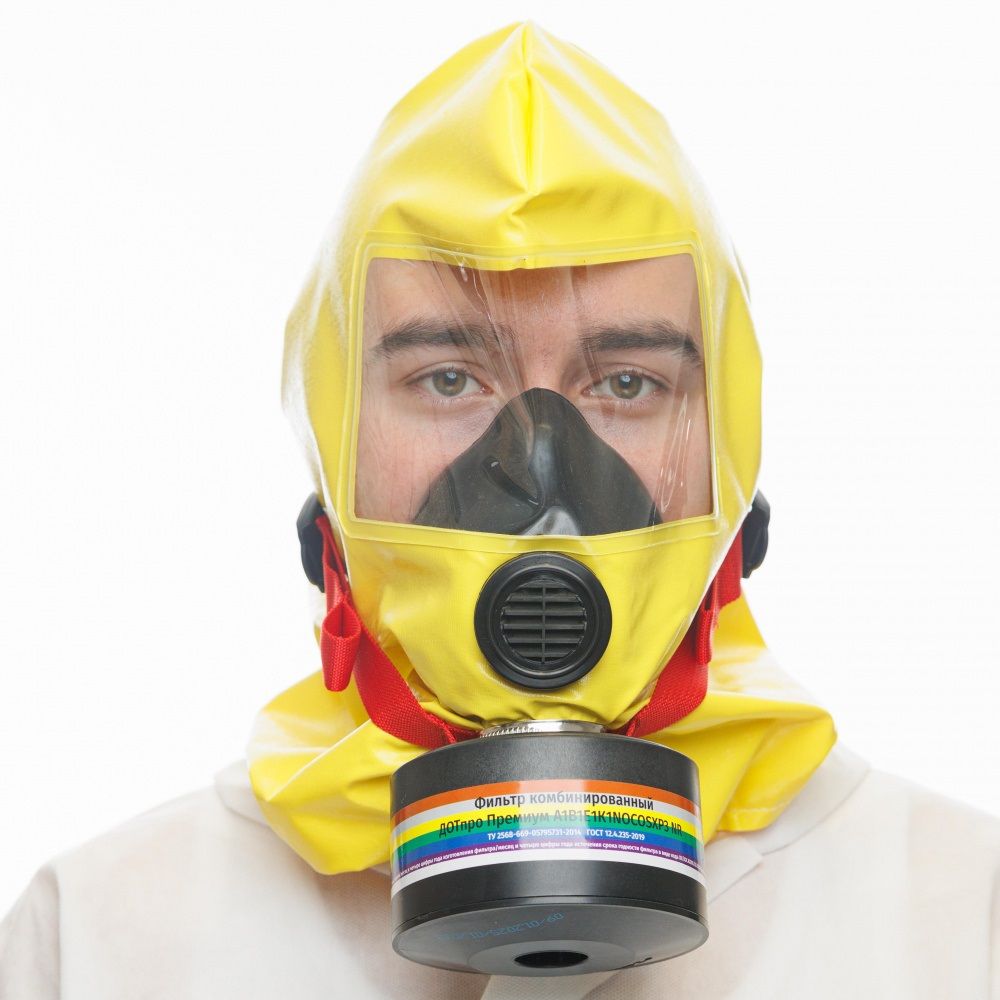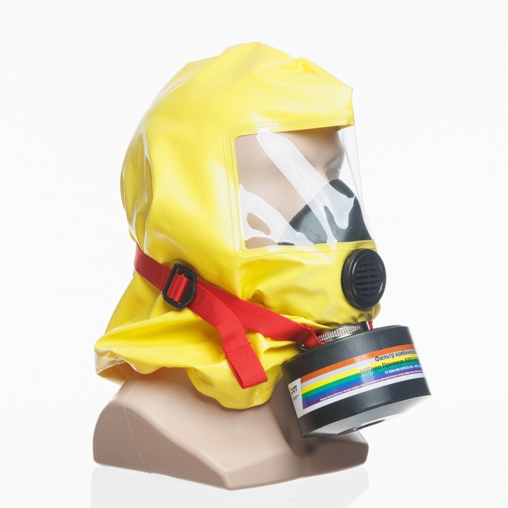 Самоспасатель ГДЗК-У Премиум состоит из огнестойкого капюшона со смотровым окном, капюшон герметично соединен с подмасочником, на котором закреплены узел клапана выдоха и комбинированный фильтр марки А1В2Е2К2HgNOCOSXP3D.