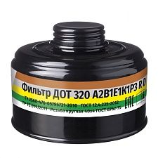 Фильтр комбинированный ДОТ 600 А2В2Е2К2Р3 R D в металлическом корпусе предназначен для защиты от органических газов и паров с температурой кипения cвыше 65°С (бензол, ксилол, толуол, бензин, керосин, галоидорганические соединения, анилин, кетоны, тетраэтилсвинец, нитросоединения бензола и его гомологов и т.п.); неорганических газов и паров (хлор, фтор, бром, сероводород, арсины, фосфористый водород и т.п., за исключением монооксида углерода и циана водорода); кислых газов и паров (диоксид серы, хлористый водород, бромистый водород, фтористый водород, пары серной, уксусной, муравьиной, азотной, фосфорной кислот и т.п.); аммиака и его органических производных; аэрозолей (пыль, дым, туман), в комплекте промышленного фильтрующего противогаза ДОТ.