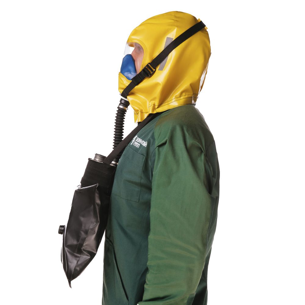 Противогаз представляет одно- или двухканальный изолирующий дыхательный аппарат, снабжающий пользователя чистым воздухом для дыхания через шланг подачи воздуха с помощью нагнетателя.