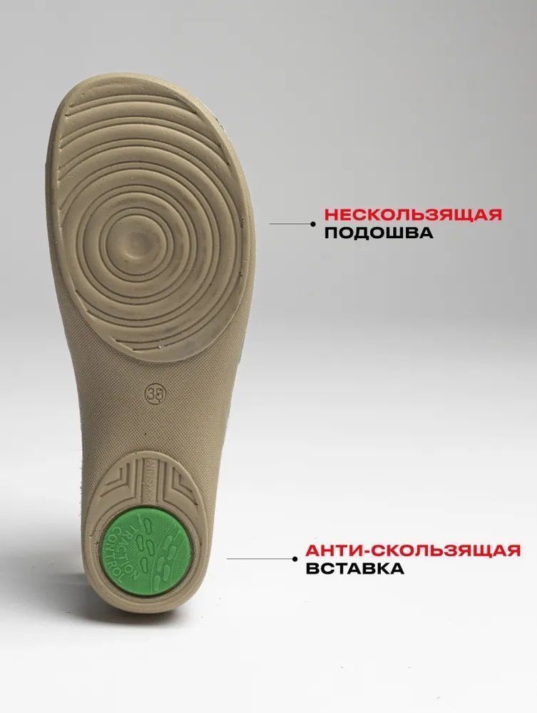 Легкая полиуретановая подошва, оснащена амортизационной вставкой, что уменьшает усталость ног. Не скользящая основа позволит чувствовать себя уверенно на кафеле и паркете.