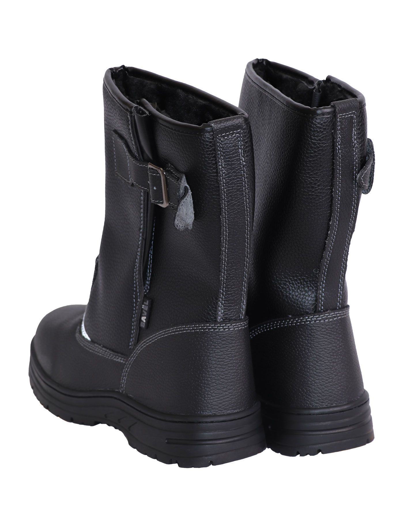 Сапоги из натуральной кожи и искусственных материалов, голенище регулируется пряжкой, высота сапога около 260 мм (от пола), основная стелька из штробельного материала, комфортная вкладная стелька из кожкартона дублированного волокниной, искусственный мех, внутренний металлический подносок до 200 Дж, удобная колодка анатомической формы.