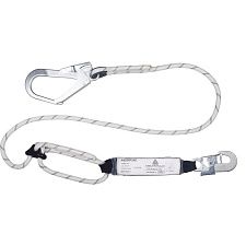 Строп регулируемый канатный с амортизатором и соединительными элементами. Материал: строп – канат из полиамида (диаметр 12 мм), амортизатор – полиэстер (ширина 47 мм), соединители – сталь. Длина стропа регулируется с помощью зубчатого кольца от 1,5 м до 2,0 м. Петлевые наконечники. Амортизатор защищен прозрачной термопластиковой пленкой с возможностью визуального контроля. 2 соединительных элемента: 1 карабин-крюк AM010 (раскрытие – 16 мм) и 1 карабин-крюк AM022 (раскрытие – 51 мм). Строп испытан на 140 кг