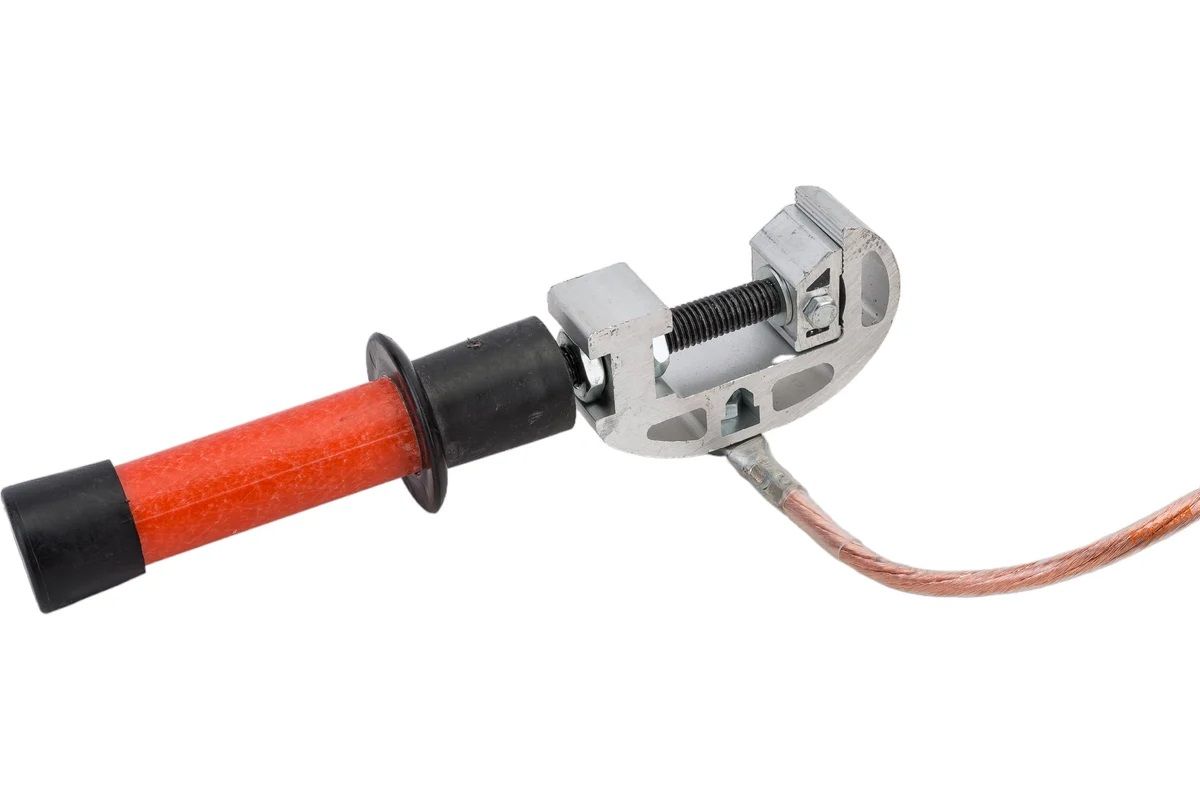 Заземление переносное ЗПП-15Д для распредустройств до 15 кВ, состоит 3-х зажимов, провода сечением 25мм2 в прозрачной оболочке и струбцины с рукояткой и укомплектовано штангой ШЗП 10/15.
