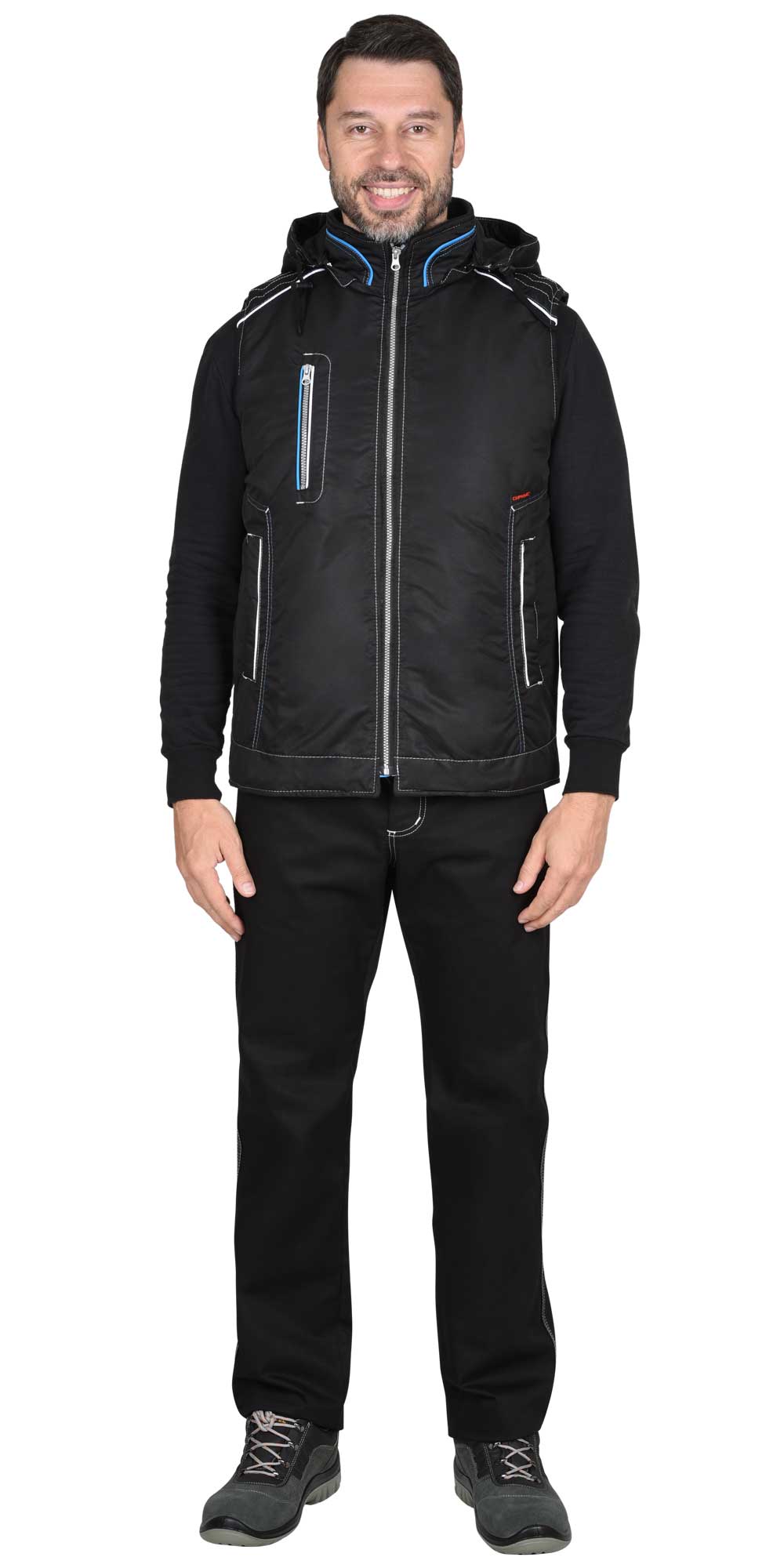 Жилет, с утеплённой подкладкой, однотонный с отделочными строчками и отделочными кантами контрастных цветов. Жилет с воротником стойка, с застёжкой на молнию, с внутренним ветрозащитным клапаном, со съёмным капюшоном, который пристёгивается к воротнику на молнию. Спинка жилета, удлинённая с фигурной линией низа. Жилет с одним нагрудным карманом с молнией и двумя нижними боковыми карманами. Внутренний воротник из флиса. Объём капюшона по лицевому вырезу регулируется шнуром с фиксаторами. Подкладка с утеплителем, с внутренним карманом с молнией.