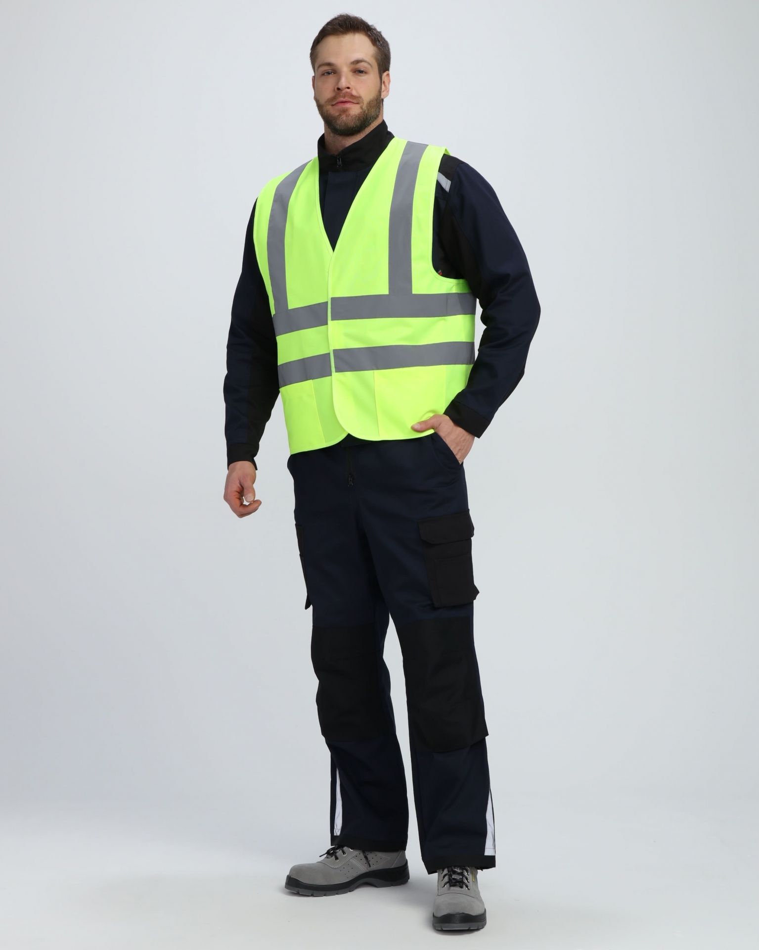 Жилет застёгивается на молнию. Сверху на воротнике предусмотрен небольшой клапан, предотвращающий соприкосновение подбородка или шеи с застёжкой. Высокий воротник с подкладкой из мягкого микрофлиса создаёт уют и дополнительно защищает от ветра. Спинка жилета удлинённая, что уберегает поясницу от продувания. Проймы и низ изделия оформлены трикотажными вставками. Это обеспечивает более плотное прилегание. В жилете есть два наружных кармана для рук и два внутренних кармана для важных мелочей. Также предусмотрен нагрудный карман под молнией. Флуоресцентный цвет и широкие светоотражающие полосы на поясе и плечах гарантируют повышенную заметность в тёмное время суток или на неосвещаемых объектах. Жилет имеет 2 класс видимости. Подходит сотрудникам дорожных и логистических служб, а также специалистам нефтегазовой промышленности.
