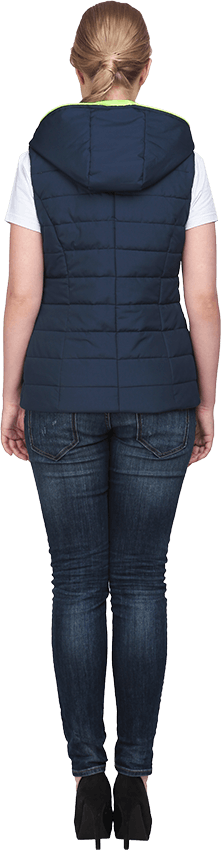 Слегка приталенный женский жилет, предназначенный для защиты от ветра, холода и осадков. Водонепроницаемое покрытие позволяет использовать его на открытой местности за пределами складов и цехов. Верхняя ткань Дюспо – мягкая и гибкая, но обладает высокими ветрозащитными характеристиками. Жилет простёган по кругу в нескольких местах для предотвращения сползания наполнителя. Спинка низкая, прикрывает поясницу и ягодицы. По бокам имеются косые врезные карманы на молниях. В качестве основной застёжки используется пластиковая молния. Замок с длинным язычком удобно открывать в перчатках и даже рукавицах.